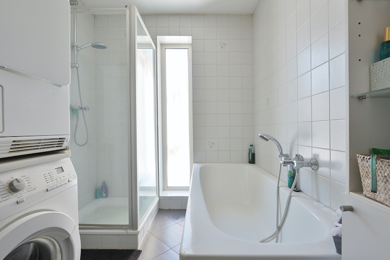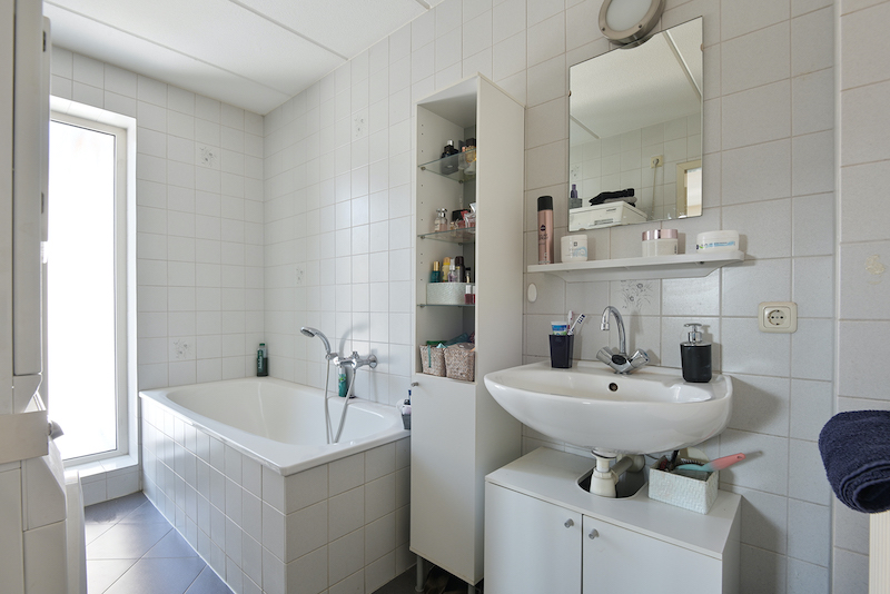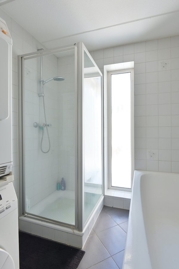 Op de begane grond treft u tevens één, van in totaal drie, slaapkamers en één van de twee badkamers aan. De badkamer is toegankelijk via de slaapkamer en is voorzien van een ligbad en wastafel. Hier is ook de aansluiting van de wasmachine.