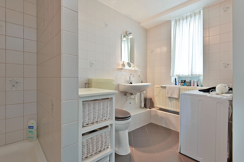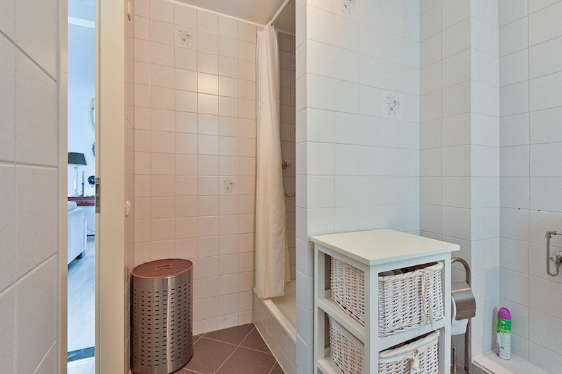 Aan de achterzijde ligt de badkamer die is voorzien van douche, toilet en wastafel. Hier is tevens de aansluiting voor de wasmachine.