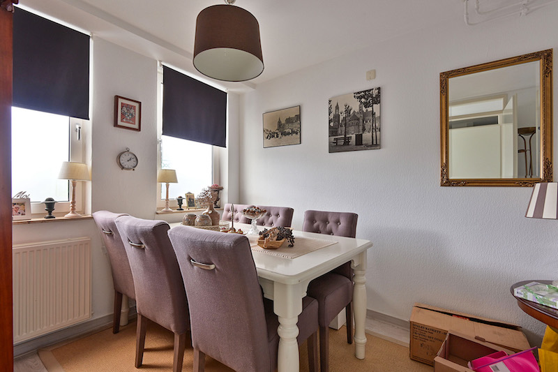 Tegenover de badkamer bevindt zich de 1e van twee slaapkamers. De huidige huurder heeft deze kamer, zoals u kunt zien, als eetkamer ingericht.